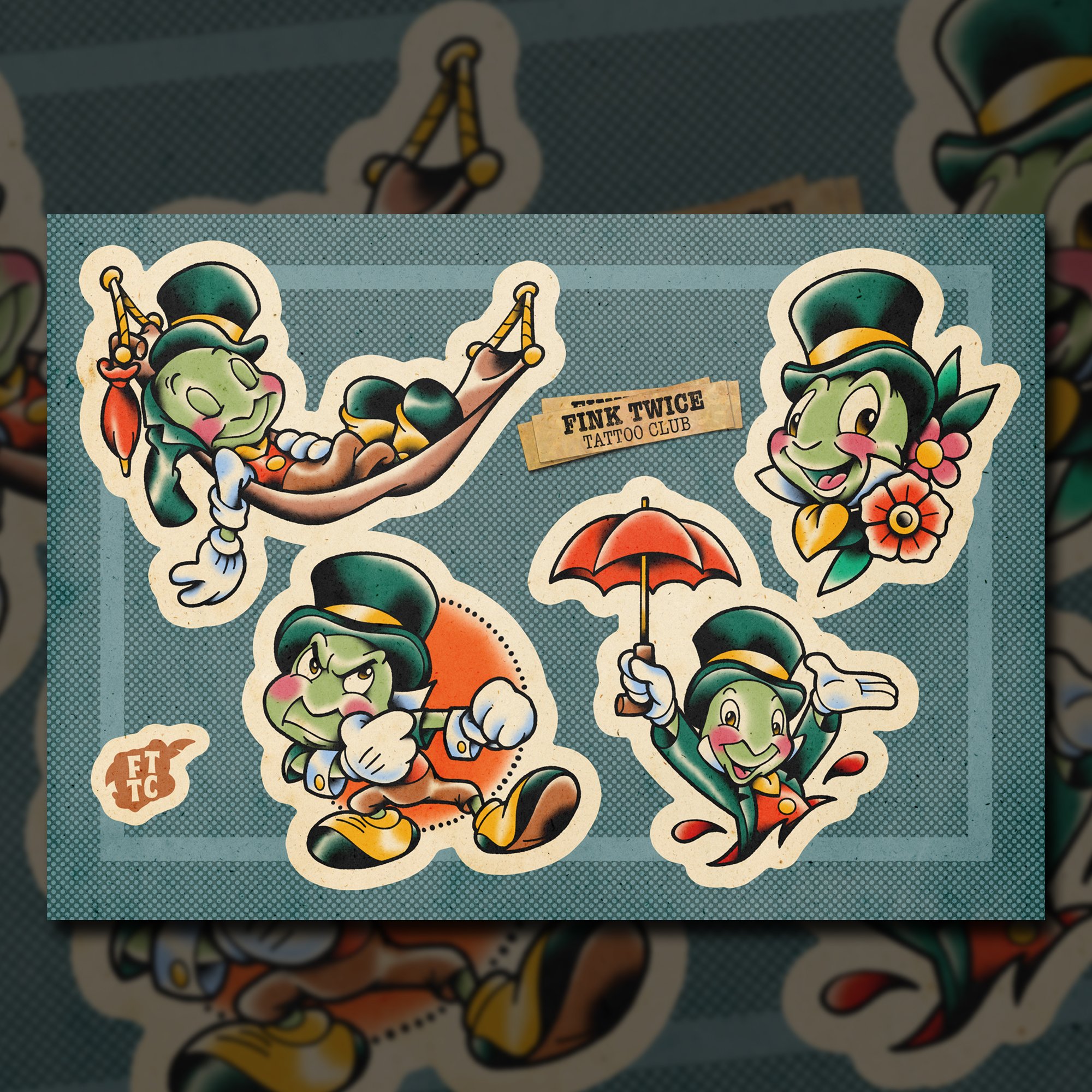 Tattoo Flash sheet inspired by Jiminy Cricket from Disney's Pinocchio.